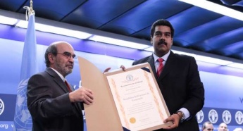 “These countries are leading the way to a better future,” said FAO Director-General José Graziano da Silva, shown here presenting a certificate of recognition to Venezuelan President Nicolas Maduro (AVN) .