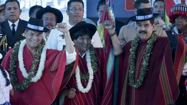 Bolivian President Evo Morales (C) gestures with the presidents of Ecuador and Venezuela during a closing ceremony of the climate change conference in Bolivia, Oct. 12, 2015.
