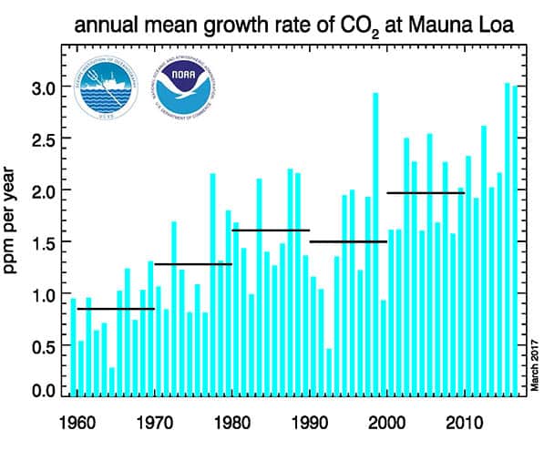 The two-year, 6-ppm surge in the greenhouse gas between 2015 and 2017 is unprecedented in the observatory’s 59-year record. And, it was a record fifth consecutive year that carbon dioxide (CO2) rose by 2 ppm or greater, said Pieter Tans, lead scientist of NOAA’s Global Greenhouse Gas Reference Network.
