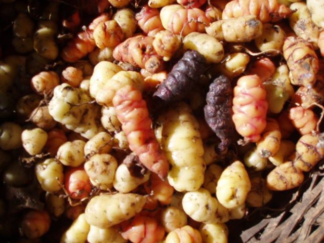 Rubas are small potatoes, also called “smooth potatoes” or “ñucos”. They come in two varieties, one of them yellow or green, and the other one red, Cantalicia tells us. They are a bit juicier than a potato and can be used, for example, to make spicy sauces. Cuibas are similar to a carrots, and very nutritious. They can be used in salads, soups, juices or even eaten raw. Mashuas are spicy, and mostly used in sauces, and they are said to be good for those suffering from diabetes. Their leaves can also be used to make tea or infusions.
